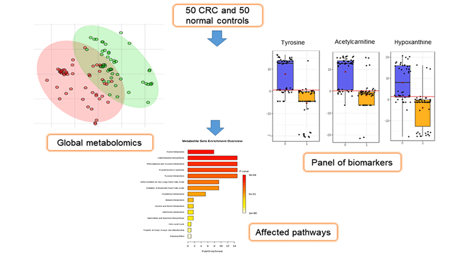 Global Serum from metabolomics on colorectal cancer (CRC) identified 11 differential metabolites which able to identify a new set of sample with 80% of accuracy. Pathway analysis shows purine, catecholamine and amino acid metabolism were altered in CRC patients.