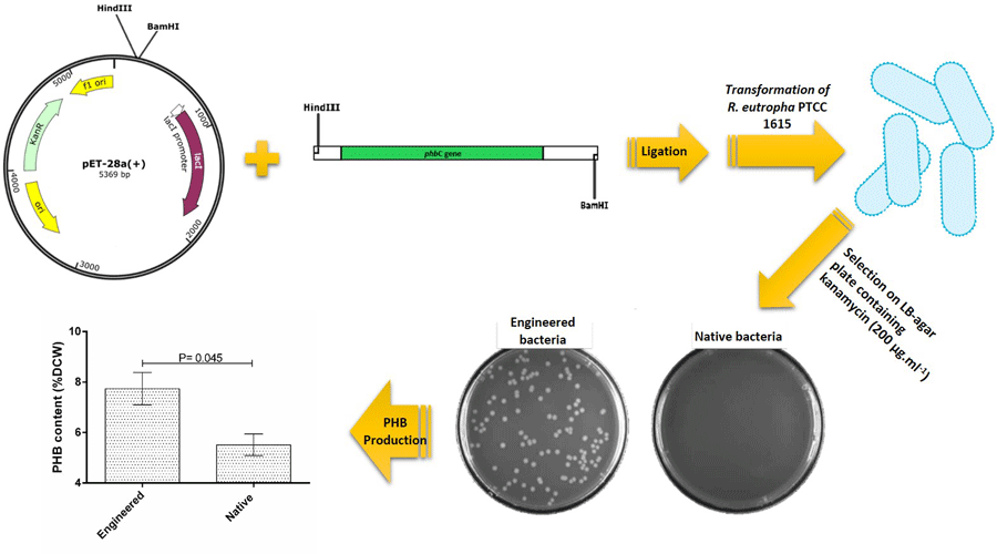 Overexpression of phbC, the critical gene in PHB biosynthesis pathway, in R. eutropha PTCC 1615 had considerable effect on PHB accumulation.