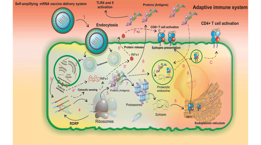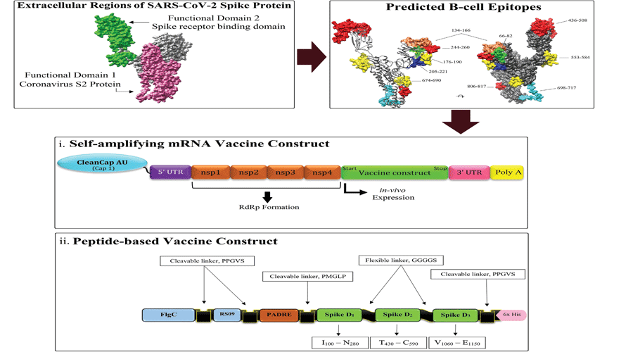 Immunodominant T-cell epitopes of SARS-CoV-2 spike protein with the highest population coverage were predicted by analyzing peptide binders and consensus rank (CR) score. Multi-method B-cell epitope prediction approach was used to find B-cell immunodominant regions of spike protein. Upon the high immune-potent regions of the antigen(s), self-amplifying mRNA and peptide-based vaccines were designed.