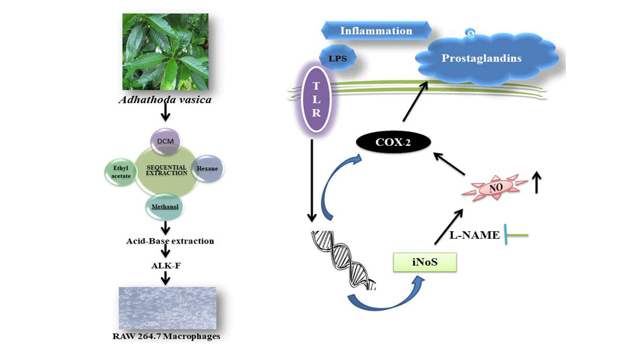LPS stimulated the expression of inducible nitric oxide synthase (iNOS) and cyclooxygenase (COX)-2 by binding toTLR-4. iNOS produced enormous nitric oxide (NO) that stimulated COX-2 activity and prostaglandin E2 which further induced the production of pro-inflammatory cytokines leading to inflammation. ALK-F of A. vasica could attenuate iNOS and COX-2 gene expression reducing NO production.