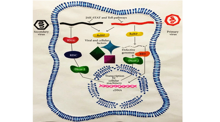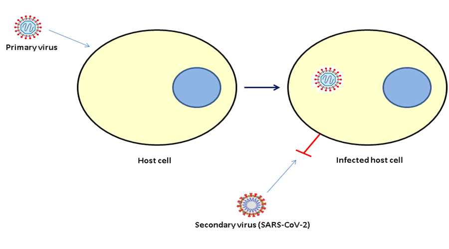 A schematic representation of the application of viral interference phenomenon in prophylaxis of COVID-19. The viral interference is a competition phenomenon by which a primary virus infecting a cell prohibits the infection of the same cell by another (secondary) virus.