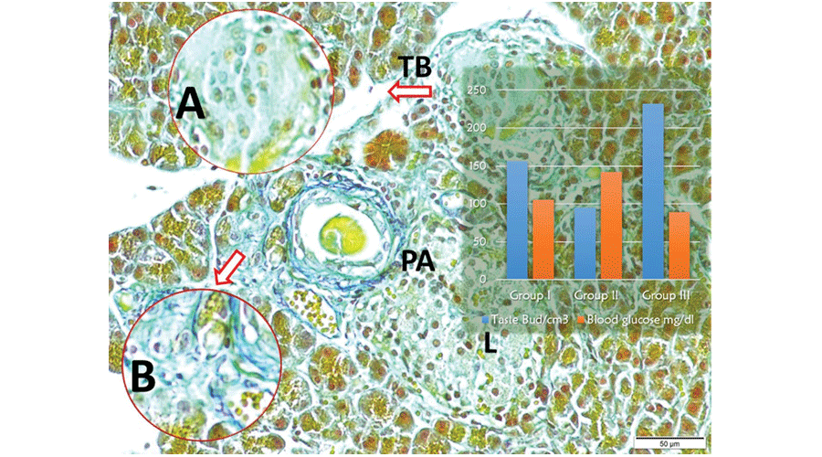 Histological view of the pancreas, pancreatic arteries, and appearances of taste bud-like structuresaround PA, Langerhans cells.