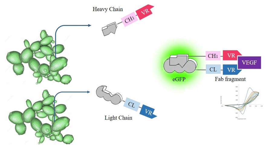 Recombinant heavy and light chains of anti-VEGF-A monoclonal Ab Fab fragment were produced in Pichia pastoris. Reconstruction of Fab fragments was verified by anti-Fab Ab and a split system. An electrochemical setup was used to test the interaction of the reconstructed Fab fragment with VEGF-A.