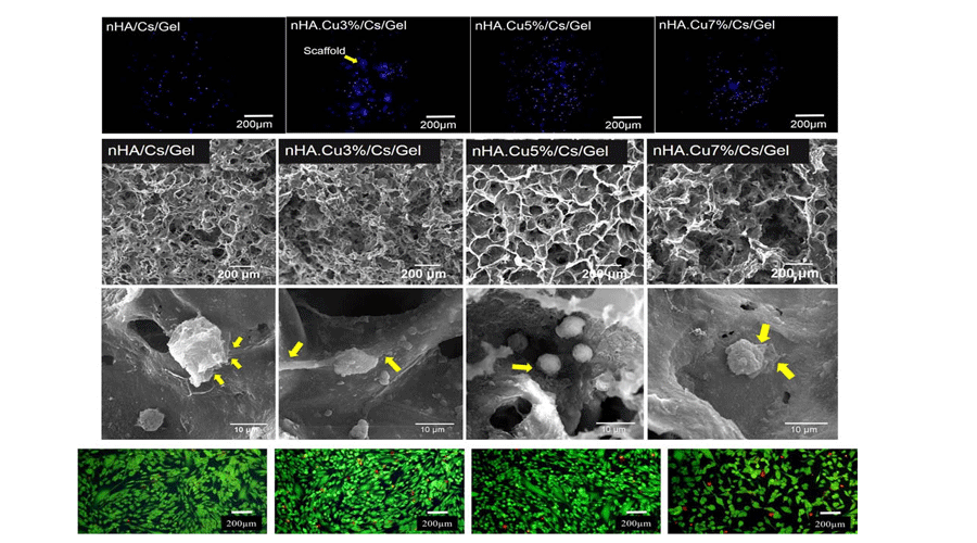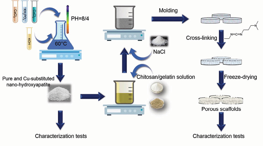 An overview of the fabrication process of pure and Copper (Cu)-substitutednano-hydroxyapatite/chitosan/gelatin (nHA/Cs/Gel) scaffolds followed by the characterization of physical, chemical, and biological properties as proper candidates to bone tissue engineering scaffolds.