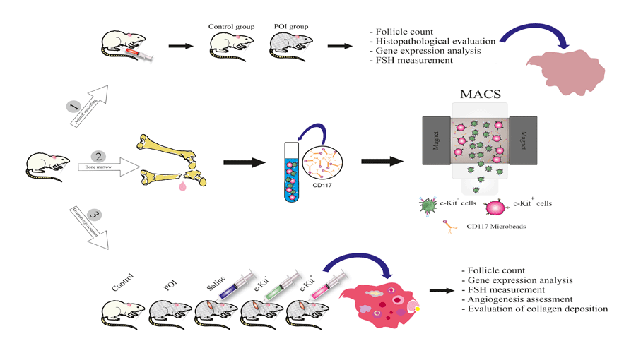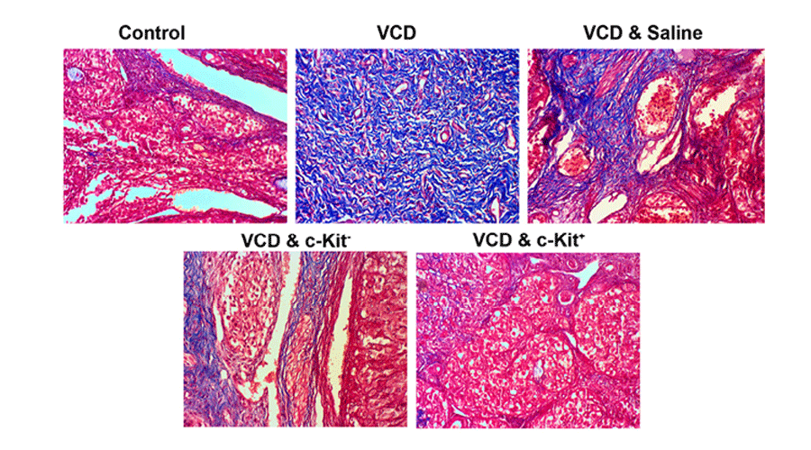 The administration of c-Kit+ cells can modulate angiogenesis and pathological changes, leading to the rejuvenation of ovarian function of a rat model of premature menopause.