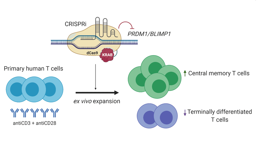 PRDM1/BLIMP1 expression is increased during differentiation from naïve to effector T cell.CRISPRi-mediated suppression of this transcription factor in ex vivo-expanded primary human T cellsresulted in increased central memory phenotype in human T cells.
