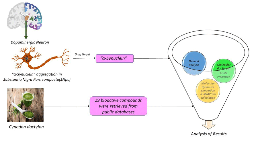 The bioactive compounds from Cynodon dactylon potentially degrade the α-Syn aggregation in the brain through in silico molecular docking investigations. A molecular dynamics simulation confirms the stability of the α-Syn-ligand complex.