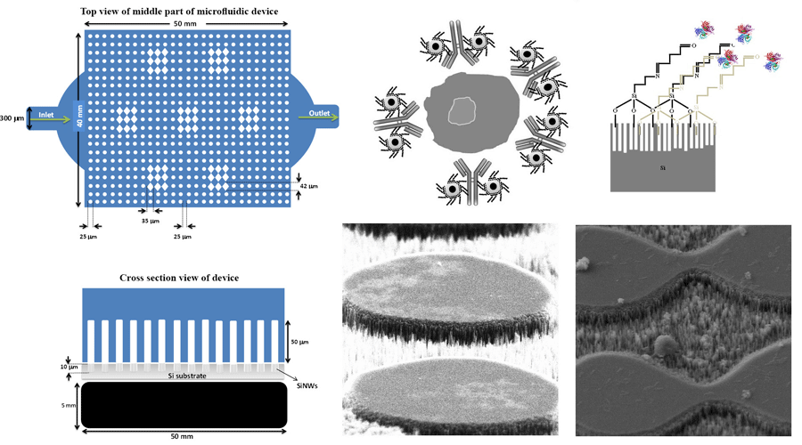 Schematic of the microfluidic device, top view and cross section of the middle part of the microfluidic device, tumor cell labeled with the functionalized antibodies with the Fe3O4 PMNPs, surface functionalization of the Si nanowires, SEM images of the middle part of the Si substrate with well-aligned SiNWs, SEM images of the tilted view of cancer cells trapped on the nanowires substrate microfluidic channel.
