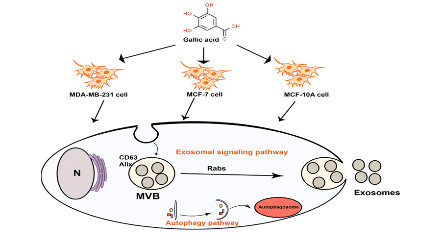 Treatment of MCF-10a, MCF-7, and MDA-MD-231 cells with Gallic acid resulted in inhibition in the activity of the exosomal secretory pathway. Gallic acid can decrease the expression of genes involved in exosomes biogenesis (Alix and CD63) and secretion (Rab proteins). In addition, Gallic acid can change the expression of autophagy markers (LC3 and P62) in these cells. MVB: multivesicular body.