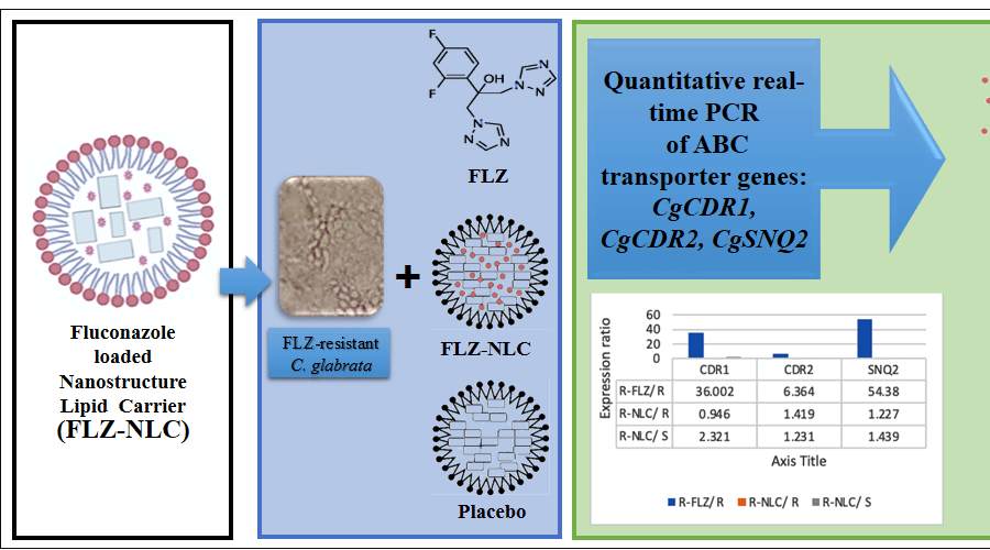 Due to the occurrence of fluconazole resistance to Candida glabrata, four resistant as well as one standard isolates were exposed to fluconazole loaded nanostructured lipid carrier alongside conventional fluconazole. These data represent the possible changes in efflux pumps genes expression.