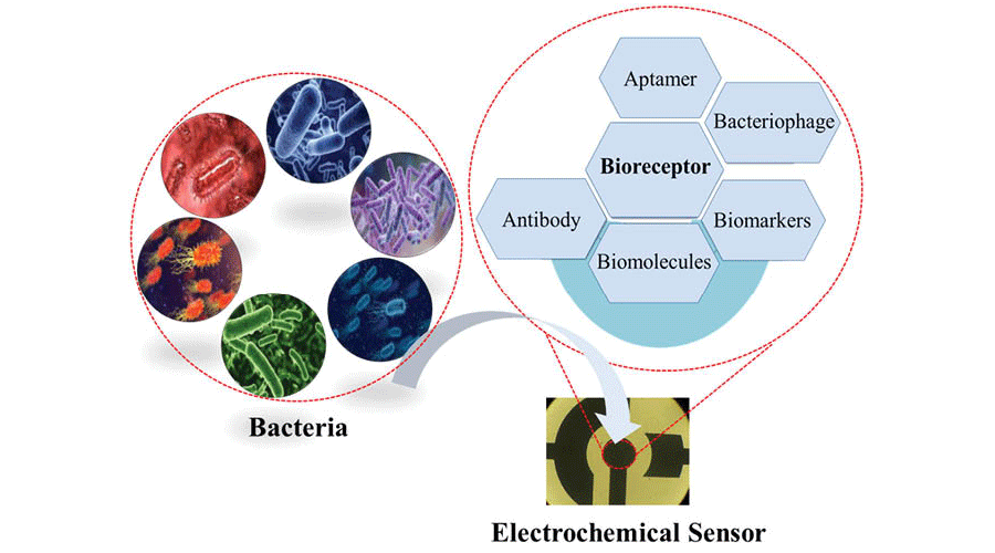 This review presents an overview of different recognition elements on an electrochemical platform for the detection of bacteria.