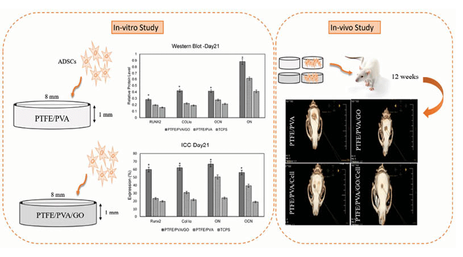 PTFE/PVA/GO/ADSCs construct has a promising result in in-vivo bone regeneration and could be used for large animal models and subsequently for clinical usage.