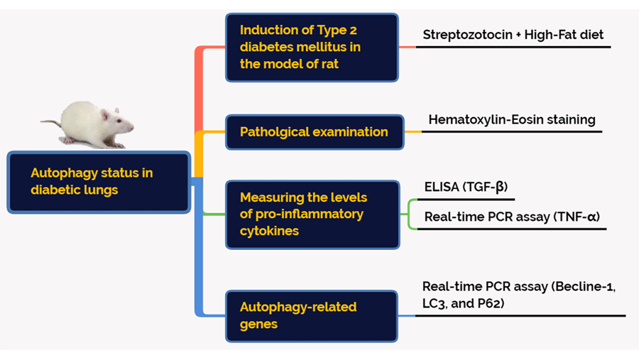 This study aimed to investigate the effect of type 2 diabetic condition on autophagy status in lung tissue of male rats. The possible relationship between autophagy and inflammation was also monitored.