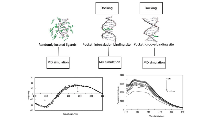 The MD simulation and spectroscopic studies of the interaction of ct-DNA and propyl acridone revealed that a transition from the extended nucleic double helix towards the denatured structure.