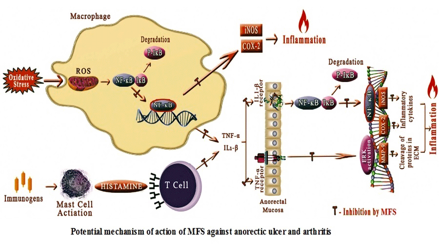 The proposed mixed flavonoid supplement has a great potential to inhibit both anorectic ulcer and arthritis by suppressing NF-κB mediated MMP9 and cytokines.