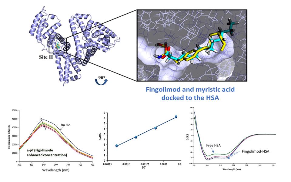 Interaction of the Fingolimod with HSA was studied using multi-spectroscopic and molecular modeling methods. Fingolimod binds to the binding site II of HSA via hydrogen bonds and Van der Walls forces. The binding is enthalpy driven. Fingolimod interaction with HSA leads to the conformational change of HSA.