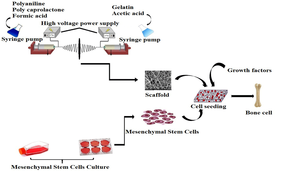 PCL-PANI-GEL fibers showed to be capable candidates for cell attachment and growth. Furthermore, they proved to be of excellent use in bone tissue differentiation.