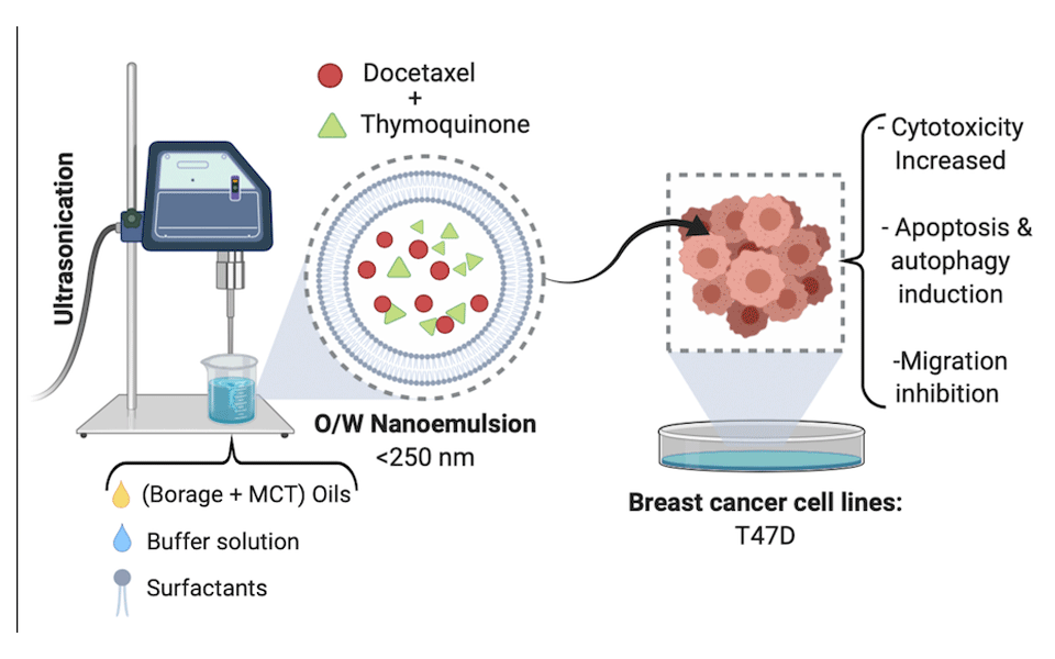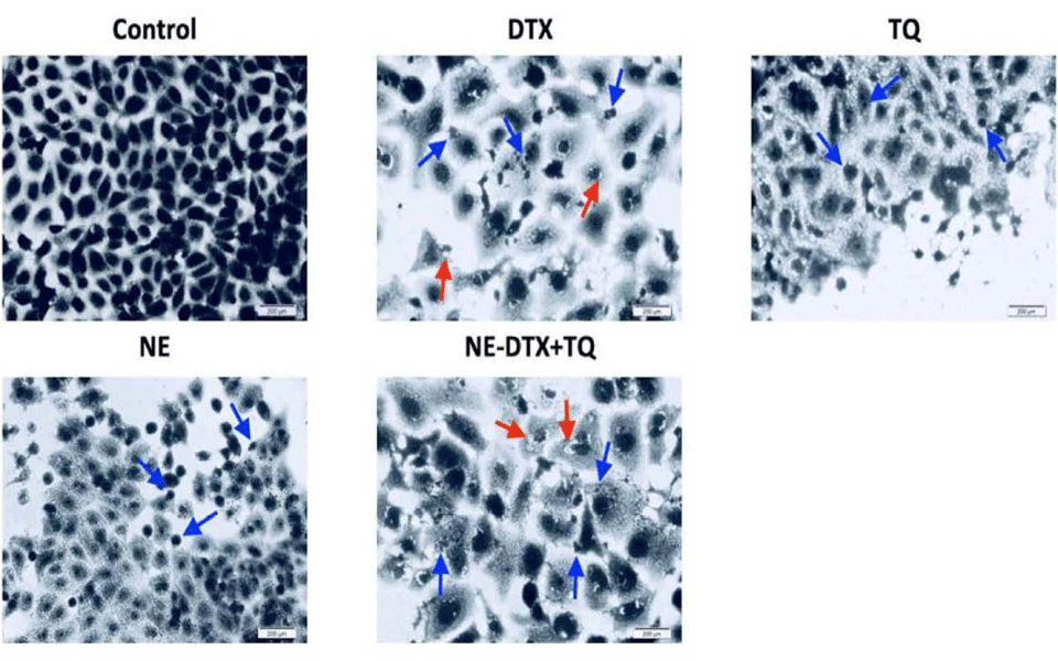 Co-delivery of NE-DTX+TQ may probably inhibit the proliferation of T47D via the induction of apoptosis and autophagy pathways and impede the migration by reducing the BCSC population and downregulating TWIST-1 expression to decrease the epithelial-to-mesenchymal transition (EMT) of breast cancer cells