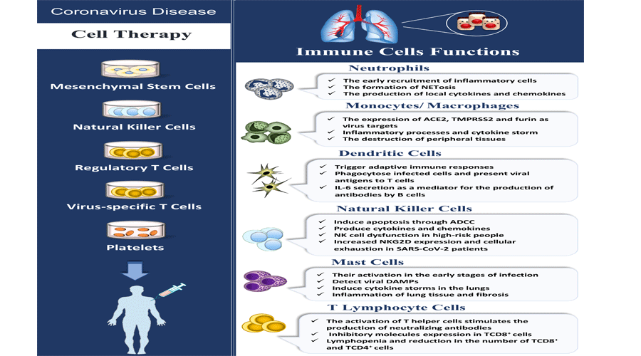 In COVID-19 infection, the various functions of immune cells lead to defense or failure against the virus. Cell therapy is of great importance as a new treatment for COVID-19 infection. Therefore, in this review, we have dealt with the function of immune cells against the SARS-Cov-2 virus and new treatment methods for this disease with the help of different cell types