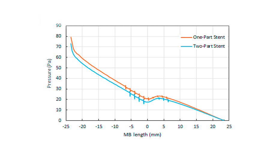 The CFD analysis of a bare-metal stent on the hemodynamics in the main branch of a coronary artery bifurcation CFD showed that the main branch with an inserted one-part stent displayed the smallest region with the wall shear stress.