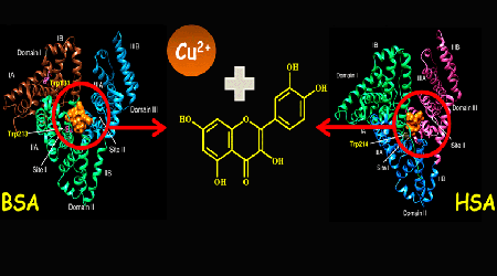 Interaction of Quercetin and its Cu2+ complexes with serum albumins was studied. Complexation with Cu2+ altered the mode of binding of Qu with SAs, and strength of binding increased as evident from the binding constant calculation.