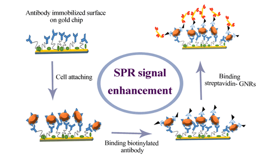 Streptavidin functionalized gold nanorods act as intensification labels for the detection of cell surface markers in SPR biosensors. In the cell-based SPR biosensor, binding specific biotinylated antibody on the cell surface, streptavidin- gold nanorods can enhance SPR signals.