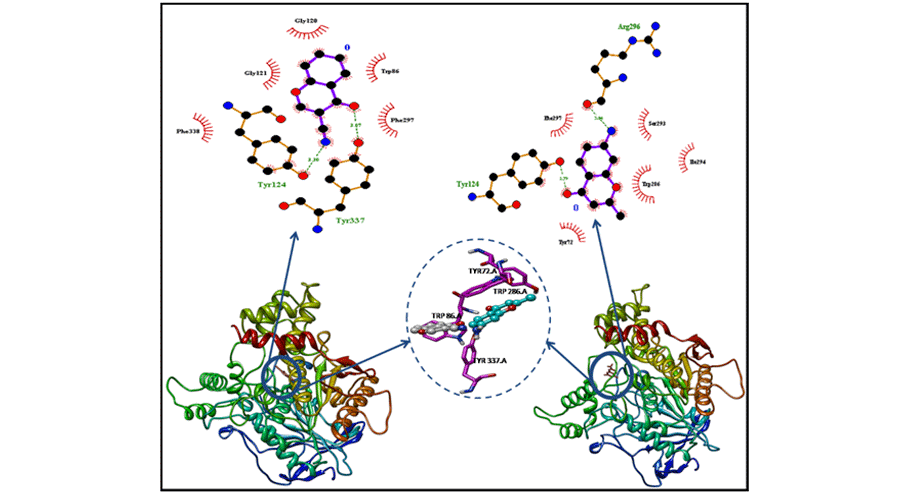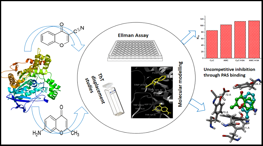 Two chromone derivatives, CyC and AMC exhibit strong non-competitive acetylcholinesterase (AChE) inhibition. CyC, due to planarity and greater stacking interactions with Peripheral Anionic Site, is the stronger AChE antagonist and plasma protein binder.