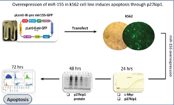 Flow cytometric analysis results of K562 cells transfected with pLenti-III-pre mir155-GFP construct showed a significant increase in cell apoptosis. Gene expression and protein level of p27kip1 were upregulated. However, there was no change in c-Myc expression profile.