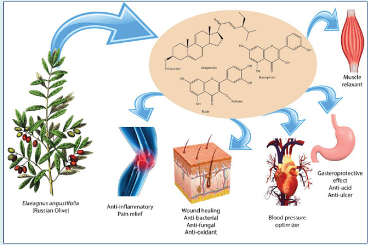 In this family; E. angustifolia is famous for its medical benefits. Traditionally, it has been used as an analgesic, antipyretic and diuretic herbal medicine. A large number of compounds have been derived from Russian olive and made this plant a source of flavonoids, alkaloids, minerals and vitamins. Several experimental studies have been done and some advances in drug formulation and herbal medicine have been achieved. This review tries to gather the most important documentary information on its active components and their relation to the Russian olive pharmacological properties and compare them with reported medicinal effects. Another review on this plant has been published recently, but we tried to check more articles with conflicting reports for writing better and more comprehensive systematic review.
