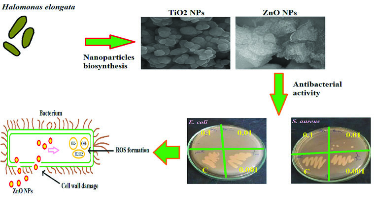 In this case, size distribution and morphologies of the MNPs can be controlled by changing reaction conditions such as pH, temperature, culturing time, metal salts concentration, electron donor of reaction media such as fructose and glucose and etc. Therefore, based on these advantages of MNPs green synthesis, in this study, the selected strain Halomonas elongata IBRC-M 10214 was applied as to TiO2 and ZnO NPs. UV-visible spectroscopy, X-ray diffraction (XRD), Fourier Transform Infra-Red spectroscopy (FT-IR), scanning electron microscopy (SEM) and dynamic light scattering (DLS) techniques were applied for the characterization of NPs. Also, antibacterial effects of the final reaction were evaluated on two pathogenesis bacteria strain with multidrug-resistant property, Escherichia coli ATCC 25922 and Staphylococcus aureus ATCC 43300.