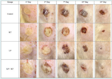During observation of wound contraction ratios of all treated and untreated groups for 2 weeks, time-dependent and treatment-dependent differences in the rate of wound contractions were determined as shown in Figs. 5 and 6. The decrease in the size of the wounded area in comparison to its original size due to the wound contraction was 76% in KT group, 78% in LP group, and was 88% in LP + KT group while it was only 67.5% for the control group at the 14thday. At the end of the second week, the wound contraction ratio was significantly higher in LP + KT group in comparison to controls and KT group or LP group (Figs. 5 and 6).