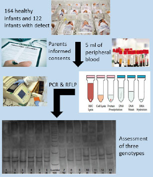 In this survey, samples were recruited from Mofid Pediatric hospital in Tehran, Iran, from 2013 to 2016. A sample of 122 newborns with a primary diagnosis of ns CL/P was collected. Control group consisting 164 Iranian newborns, simulated to cases regarding socioeconomic, traits and age, were gathered and their blood samples were collected. Cases that had other facial or skeletal anomalies (such as bifida uvula and lip pits), conotruncal heart defects, anomalies of the other organs or metabolic disorders and mother’s history of methotrexate consumption in pregnancy were excluded.