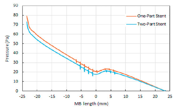 Wall Shear Stress (WSS) distribution along the red line (see Fig. 5A) on the wall of the main branch (MB) of the coronary artery bifurcation, having a one-part Omega stent or a two-part Omega stent, at t=0.587 s.