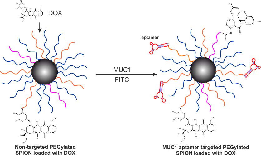 Superparamagnetic iron oxide nanoparticles (SPIONs) can be functionalized with various agents (e.g., targeting and therapeutic agents) and used for targeted imaging/therapy of cancer. In the present study, we engineered doxorubicin (DOX)-conjugated anti-mucin -1 (MUC-1) aptamer (Ap)-armed PEGylated SPIONs for targeted delivery of DOX molecules to the breast cancer MCF-7 cells.