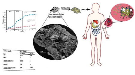Thus, one of the main challenges is finding a suitable delivery carrier to reach this goal. In this work, we have successfully composed GO with biopolymer CMC and MOF-5 in goals of enhanced solubility, antibacterial activity, delivery and controlled release of the drug into specific location. Drug loading and releasing experiments showed that the TC was efficiently loaded on and released from the CMC/MOF-5/GO bio-nanocomposite.