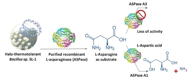 Novel L-asparaginase genes were identified from a locally isolated halo-thermotolerant Bacillus strain and the recombinant enzymes were overexpressed in modified E. coli strains, OrigamiTM B and BL21. In addition, the biochemical properties of the purified enzymes were characterized, and the enzyme activity was evaluated at different temperatures, pH, and substrate concentrations.