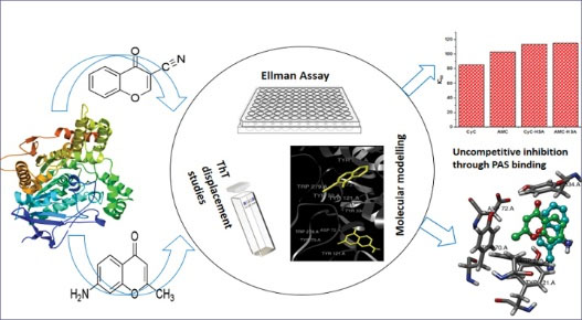 The discovery and design of curative therapies for AD is an exigent task owing to the elusive understanding of its causative mechanisms. Due to the limited effectiveness of the available drugs as well as the side effects, designing new AChE inhibitors with greater effectiveness is the need of the hour. The investigated chromones used in this study, CyC and AMC, possess pertinent lipophilicity as well as TPSA values and exhibit substantial inhibitory efficiency on AChE. CyC showed higher potency of inhibition, probably due to the enhanced facility for pi-pi stacking interactions owing to the presence of a planar tertiary amine group. CyC also showed higher modulation in HSA medium. The modulation in serum albumin matrix re-instates the significance of taking the delivery medium into consideration for screening potential AD drugs. The chromones displaced Thioflavin-T from the AChE binding site and bound non-competitively with AChE at the PAS. A comparison of the anti-cholinesterase potencies of these chromones amplify the probability of the usage of chromones, even with minimal albeit prudent fabrication of its skeleton in acting as possible cholinergic drugs in the Alzheimer’s treatment.