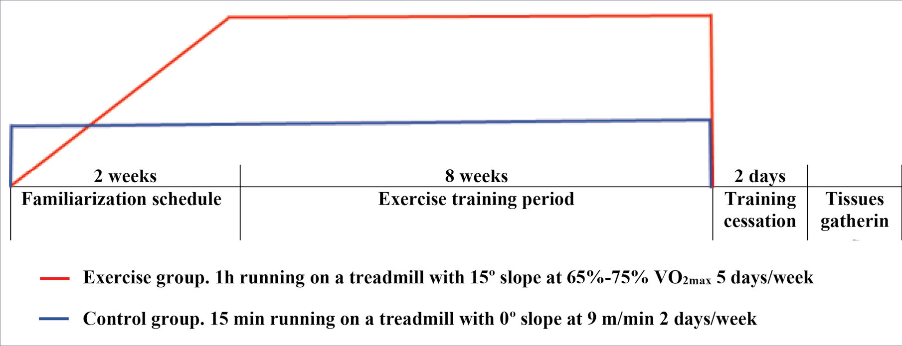 Illustration of familiarization period and exercise training protocol including duration and intensity.