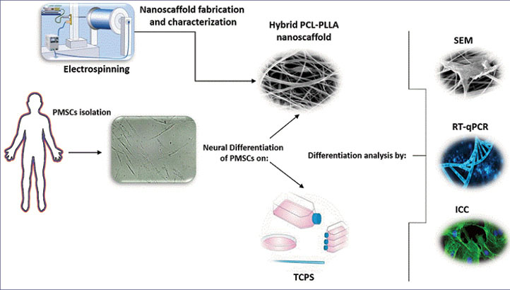 After isolation and characterization of PDMSCs, the cells were cultivated on poly-L-lactide acid (PLLA)/poly caprolactone (PCL) nanofibrous scaffold and treated with a neuronal medium for 7 days. Electron microscopy, qPCR, and immunostaining were used to examine the differentiation of PDMSCs (on scaffold and tissue culture polystyrene [TCPS]) and the expression rate of neuronal markers (beta-tubulin, nestin, GFAP, and MAP-2).
