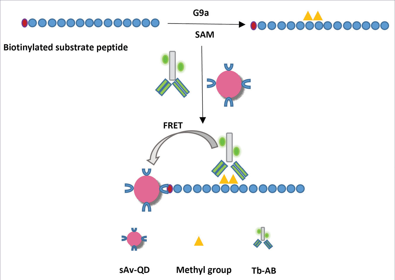 Considering these facts, herein, we developed a rapid and sensitive homogenous enzyme assay for G9a on the basis of Tb-to-QD TR-FRET. The designed assay was applied for G9a inhibitor screening.