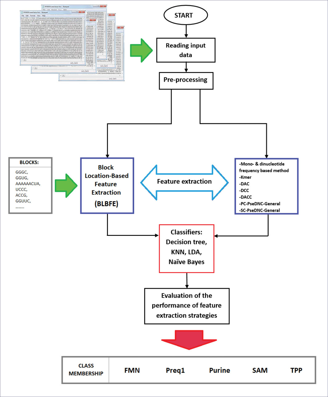In the present study, we used the BLBFE method to classify the seed members of FMN, PreQ1, Purine, SAM, and TPP riboswitch families, based on their family-specific blocks. Mono- and dinucleotide frequencies, k-mer, DAC, DCC, DACC, PC-PseDNC-General and SC-PseDNC-General, as seven separate feature extraction methods, were also considered for their comparative performances against the BLBFE method.