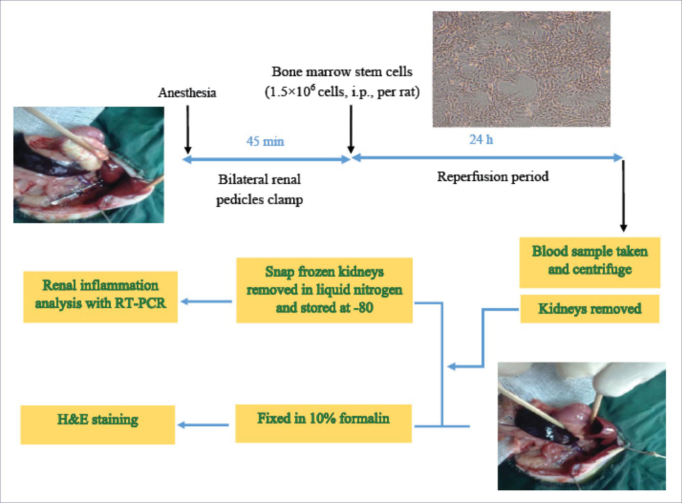 BMSCs were isolated from the bone marrow of male rats, cultured in DMEM, and characterized using appropriate markers before transplantation. Renal I/R was induced by 45 minutes bilateral ischemia followed by 24 hours of reperfusion. Rats received intraperitoneal injections of BMSCs (1.5 × 106 cells, i.p, per rat) immediately after termination of renal ischemia. Serum samples were collected pre-and post-stem cells injection for assessment of blood urea nitrogen (BUN) and creatinine (Cr) levels. The kidneys were harvested after 24 hours of reperfusion for structural and molecular analysis.