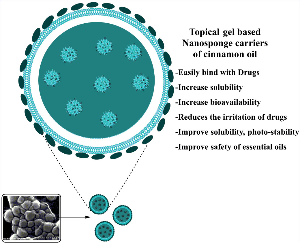 Nanotechnology also plays a vital role in the effective delivery of essential oils. As essential oils possess various therapeutic benefits but patient compliance can be a problem due to its odor and viscosity and stability. Nanosponges of cinnamon oil prepared with ethyl cellulose and polyvinyl alcohol using the emulsion solvent diffusion method were found to be a potential carrier for the oil as observed from In vitro antibacterial studies as well as drug release studies. Topical gels incorporating nanosponges were further observed as an effective, stable topical dosage form with improved and sustained release characteristics, which was further proved by In vivo antibacterial including histopathology studies and skin irritation studies. A significant In vivo antibacterial activity was observed in comparison to pure cinnamon oil. Therefore, essential oils can be better applied as nanocarriers incorporated in topical gels.