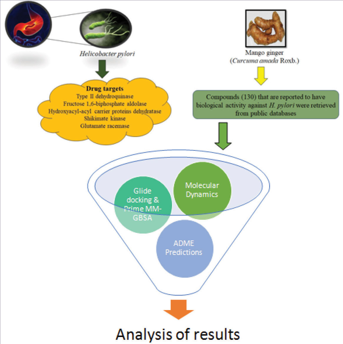 were screened and ranked based on the docking and Prime MM-GBSA prediction results. Out of the five drug targets, mango ginger compounds were found selective to shikimate kinase and type II dehydroquinase. MD simulations revealed that gentisic acid can be further studied for in vitro shikimate kinase inhibition and in vivo anti-H. pylori activity to validate the mechanism. Furthermore, mango ginger compounds can be considered safe and effective (Lipsinki’s RO5 and predicted ADME properties) to treat infections associated with H. pylori and also for development into a commercial formulation. The overall study suggests that mango ginger compounds can be studied for experimental evaluation of shikimate kinase and type II dehydroquinase inhibition to compare and validate the computational and experimental results and for identification of potential inhibitors against H. pylori.