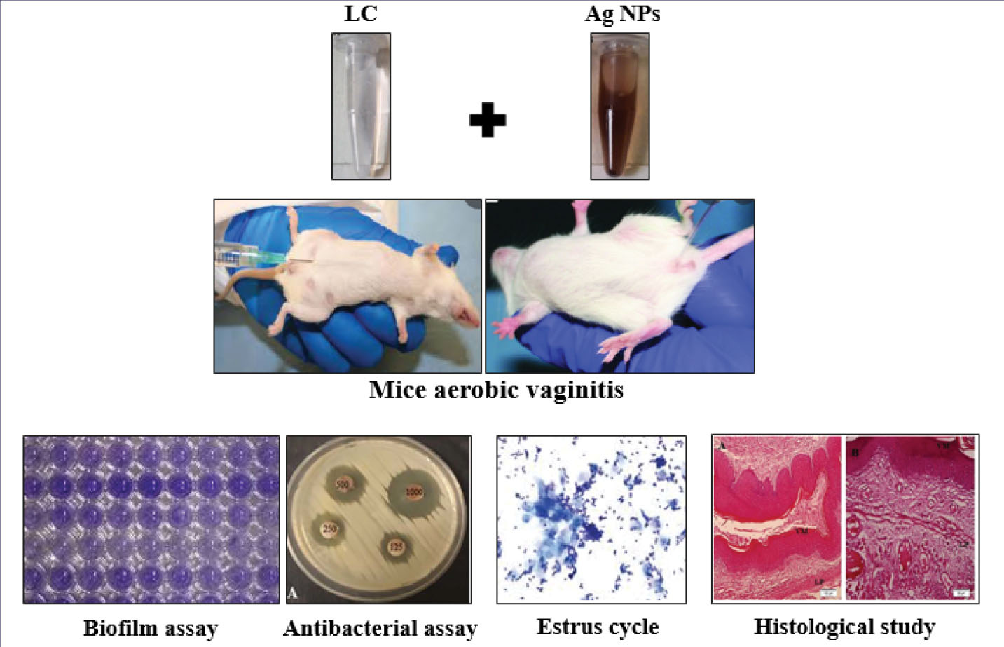 AV model was established by intra-vaginal inoculation of 108 CFU/mL Staphylococcus aureus and Escherichia coli (1:1) in adult NMRI mice. Susceptibilities of the bacteria were examined against AgNPs by inhibitory concentration (IC-50 and IC-90) and minimum biofilm inhibitory concentration (MBIC- 90) methods. The regimens therapy was intra-vaginal inoculation of AgNPs at MBIC- 90 and a daily injection of 250 mg/kg LC for two weeks. Mice were classified into healthy (control) and AV groups and then treated by LC, AgNPs, and AgNPs + LC. The vaginal smears were taken daily and tissue sections were prepared using the hematoxylin and eosin (H & E) method.
