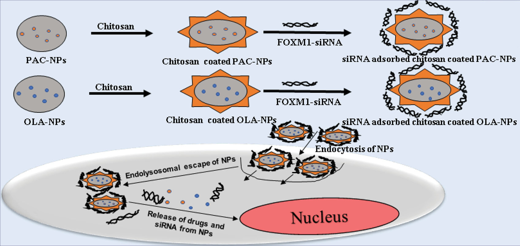 In this context, the use of nanotechnology has emerged as a weapon to co-deliver the drugs and siRNA in single nanoformulation thereby surpassing the drawbacks of conventional drug delivery technologies. 14 These nanosystems deliver the drugs and siRNA into cancer cells by enhanced permeability and retention (EPR) effect thus enhancing the therapeutic effects of the drug. 15 Polymeric nanoparticles (NPs) have shown more efficiency as a drug delivery platform. For instance, poly(lactic-co-glycolide) (PLGA) has been mostly used for various biomedical use due to its biocompatible and biodegradable nature. 16 However, for the delivery of siRNA, the surface of PLGA NPs needs to be modified with some cationic polymer such as chitosan in order to increase the transfection efficiency. 17-19 Thus, the purpose of the current study was to improve the efficacy of drugs and also to reduce the therapeutic dose of PAC by combined administration with OLA and FOXM1-siRNA in nanoformulations. This system may increase the efficiency of PAC by attaining the combinatorial effect of PAC, OLA and siRNA in NP system that can be used for TNBC treatment in near future.