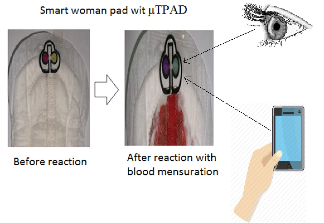 In this work, we used a thread-paper microfluidic device (μTPAD) system, where a threaded part for the handling of the whole blood samples and a paper part for the reaction of plasma with immobilized bioreagents integrated into woman pad as a wearable sensing device namely as smart women pad. The μTPAD as a wearable smart woman pad is developed for the detection of pH and urea in mensuration blood as real samples.