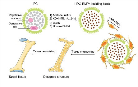 This research lays the foundation for a new green therapeutic way of using nature-produced microstructures of P. vera PGs as scaffolding building blocks for modular tissue engineering. In this respect, the modified streamlined mild method was developed to produce intact nonallergic HPGs with the ability of encapsulation of bioactive compounds. The data demonstrated the destructive effects of acidolysis and high temperature during alkaline lysis on the PGs, which are long-established parts of the pollen interior removal procedures. The in-vitro investigation of hAD-MSCs responses on the P. vera HPGs building blocks indicated that strong antioxidant properties and natural nano-engineered functional surfaces of the HPGs can provide safe and the most bioactive surfaces for cells attachment, proliferation, and differentiation. Furthermore, incorporation of BMP4 into the HPGs building blocks had a synergistic effect on bone formation.