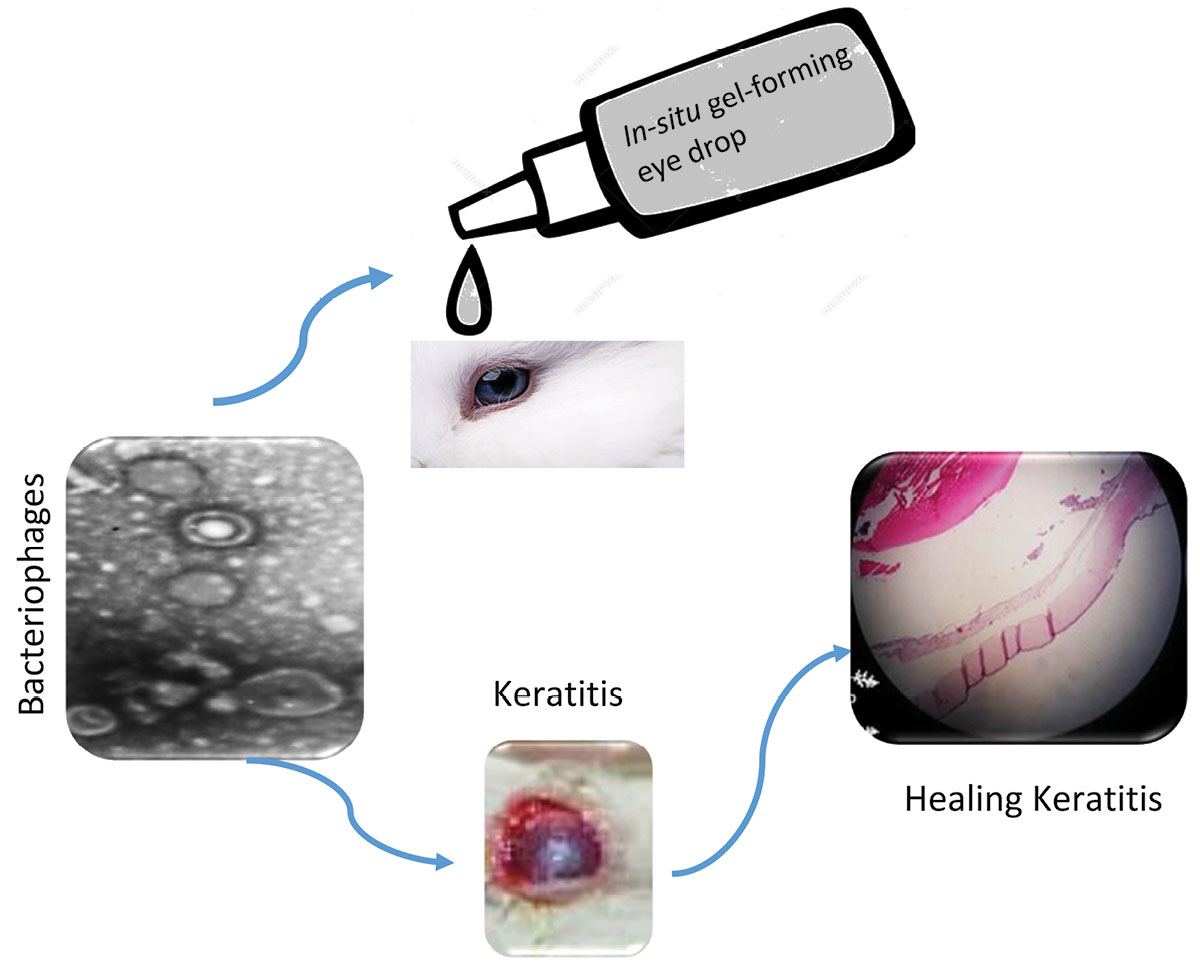 In this study, the proposed in-situ gel-forming eye drop containing phage showed an excellent outcome for the treatment of P. aeruginosa keratoconjunctivitis. The in-situ gel-forming technique can be used to produce bacteriophage eye products with new attributes such as prolonging the release of bacteriophage, increasing the durability of bacteriophage in the eye, hence lower dose of active phage ingredient. Furthermore, this technique provides a better bioavailability for the products in the treatment of eye infections.