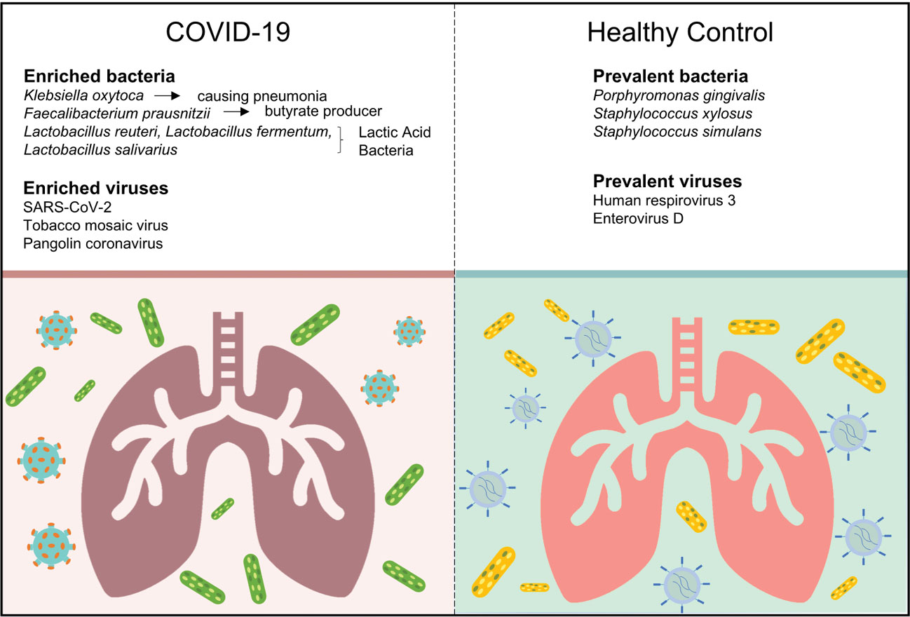 √ Pathogens (e.g., Klebsiella oxytoca, causing pneumonia as well), immunomodulatory probiotics (e.g., lactic acid bacteria and Faecalibacterium prausnitzii, a butyrate producer), and Tobacco mosaic virus were significantly enriched in the COVID-19 group, while depleted in the healthy group, suggesting a complex and active microbiota disorder in the lungs of COVID-19 patients.